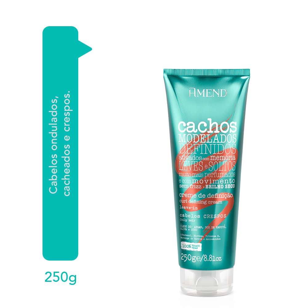 Leave-in para Cabelos Crespos Amend Cachosproporciona a definição ideal para cabelos crespos. A fórmula de alta performance foi enriquecida com os ativos: D-Panthenol e Manteiga de Karité que eliminam o aspecto áspero e ressecado, suavizando o fio; Biotina que auxilia na prevenção da queda e fortalece; Vitamina E com ações antioxidantes; um blend de Aminoácidos que reparam profundamente os cachos e um mix de óleos incríveis que protegem, nutrem, regeneram e dão movimento. Se encante com cachos hidratados, definidos, soltinhos, sem frizz, com memória por todo o dia, com muito brilho, sem o efeito molhado e com o volume que sempre quis.