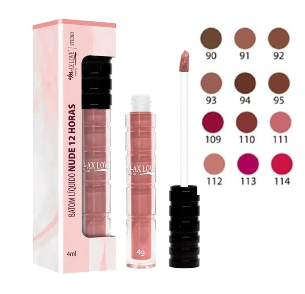 BATOM LÍQUIDO NUDE - 12 HORAS - MAX LOVE - Com uma nova embalagem a Max Love lançou o batom 12 horas, com cores e uma formula ainda melhor. Contém alta pigmentação, boa fixação na pele, cobertura suave e textura cremosa.