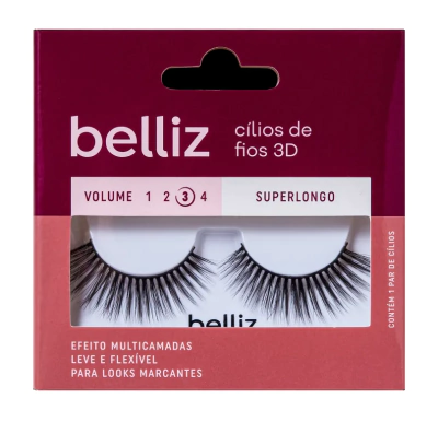 Os Cílios Postiços Belliz 3D Volume 3 Superlongo 203 garantem praticidade, segurança e conforto durante todo o tempo de aplicação, uso e remoção. Com cerdas extremamente macias, materiais leves e trama um pouco mais espaçada, o produto permite a conquista de um belo efeito impactante e natural ao mesmo tempo.