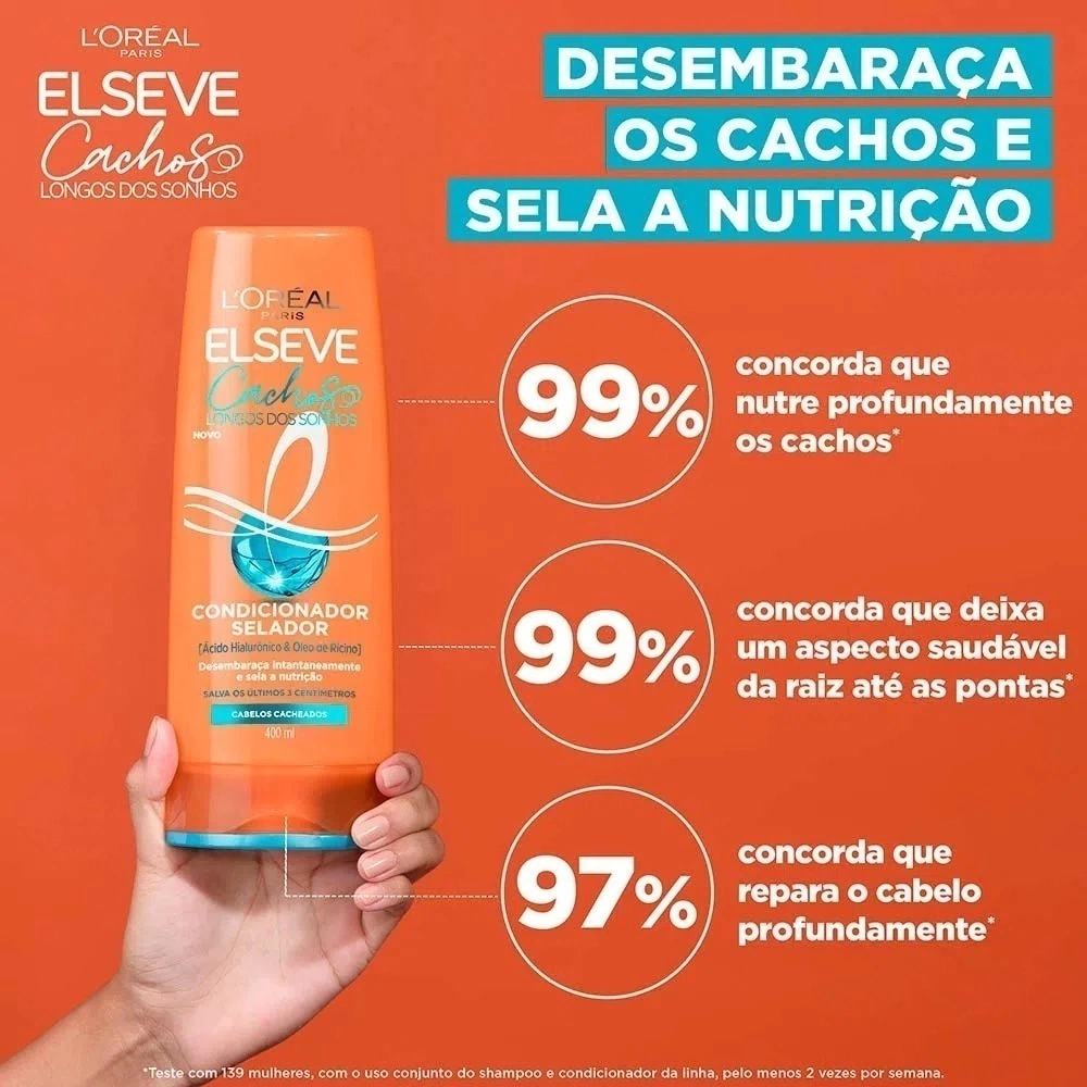 O Condicionador Selador de Elseve desembaraça instantaneamente os fios e preenche o cabelo com nutrição profunda até as pontas, para cachos mais longos, fortes e definidos desde o primeiro uso.