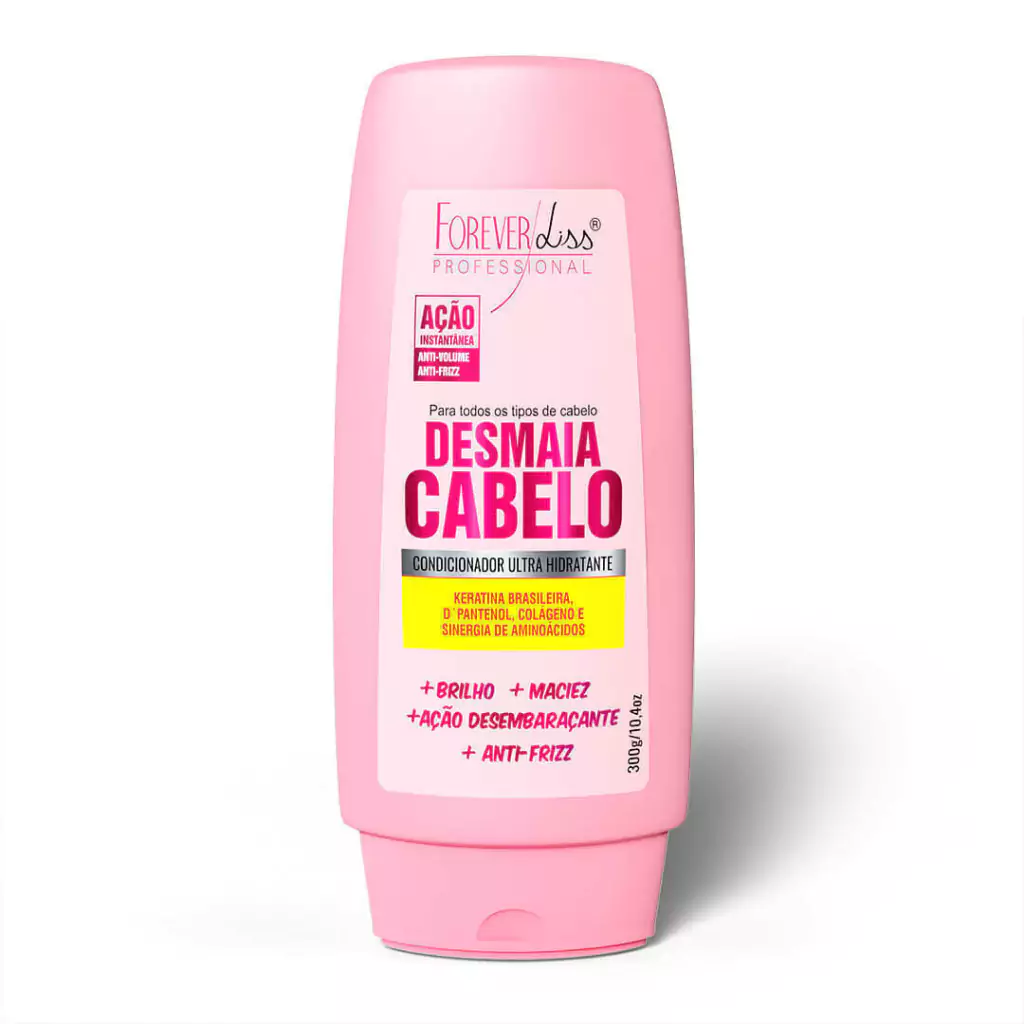 O Condicionador Desmaia Cabelo Forever Liss 300g age nos cabelos selando as cutículas de forma a reduzir a porosidade dos fios, deixando com aspecto mais saudável, com mais brilho e sedosidade. Ele tem ação emoliente, que desembaraça, proporciona brilho e facilita o penteado. Graças a seus ingredientes ativos, D-Pantenol, Keratina brasileira, Colágeno e Sinergia de Aminoácidos, este condicionador ainda auxilia na redução do volume e do frizz, deixando os cabelos mais alinhados e com efeito liso.