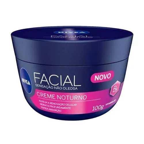 Nivea Creme Facial Noturno possui fórmula leve com vitamina B5 que auxilia a renovação celular e hidratada a pele profundamente, sem deixar sensação oleosa.