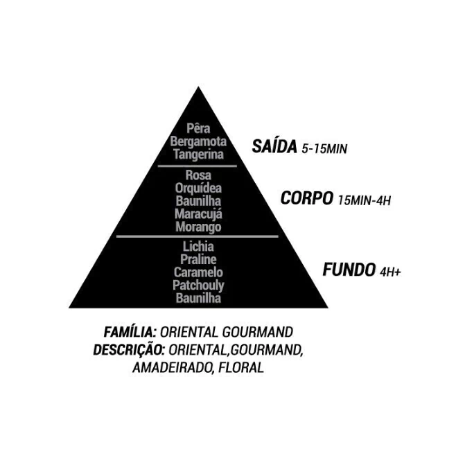 Notas de Fundo: lichia, praline, caramelo, patchouly, baunilha