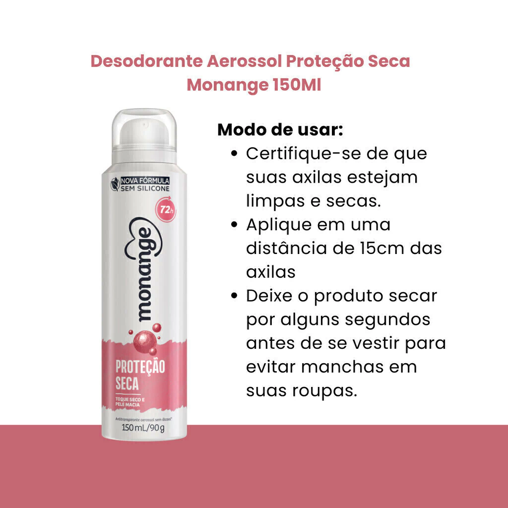 O Desodorante Monange Proteção Seca é antitranspirante de alta performance e garante proteção 48 horas. Possui uma fragrância floral suave com perfeito equilíbrio reconfortante do talco, deixando a pele com sensação prolongada de banho. Com rápida absorção, o desodorante proporciona toque seco, pele macia e nutre até a 2ª camada da pele.