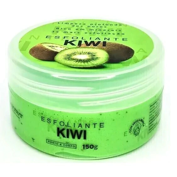 KIWI: enriquecido com vitamina a e argila verde, o esfoliante de kiwi auxilia na prevenção do envelhecimento da derme, além de remover células mortas e impurezas. indicado para todos os tipos de pele, também hidrata e garante limpeza profunda e desobstrução dos poros. ah! ele ainda pode ser usado tanto no rosto quanto no corpo.