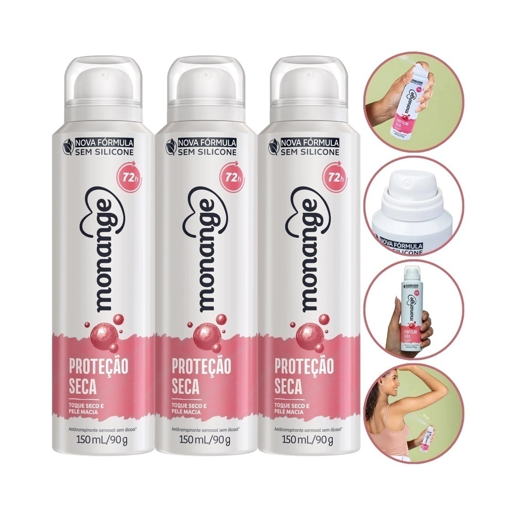 Este kit contém: 3 Desodorantes Monange Aerosol Proteção Seca 150ml